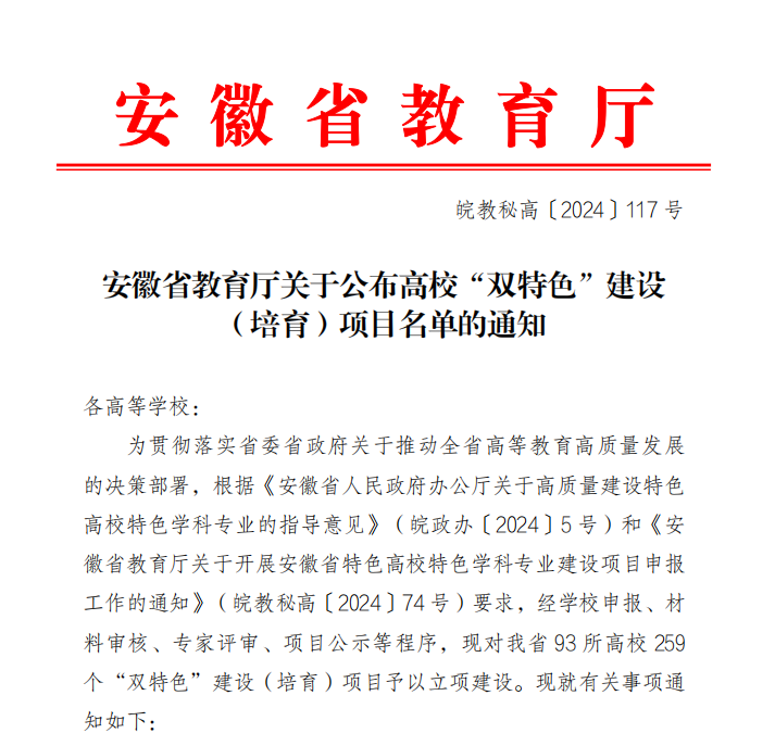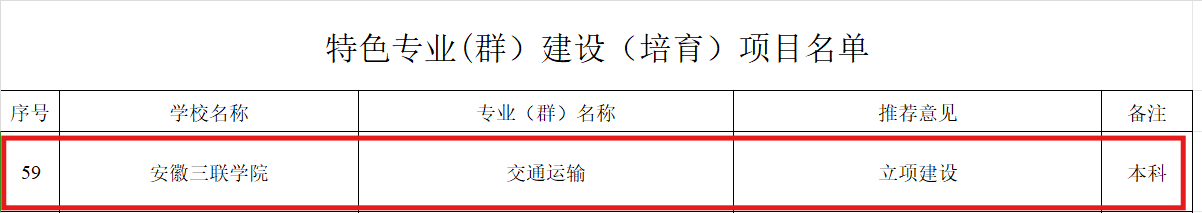 为贯彻落实省委省政府关于推动全省高等教育高质量发展的决策部署,安徽省教育厅开展安徽省特色高校特色学科专业建设项目申报工作,省教育厅对93所高校 259 个“双特色”建设(培育)项目予以立项建设。我校智慧交通现代产业学院的交通运输专业入选特色专业建设名单,这是我校首次获批省级高质量建设特色专业。