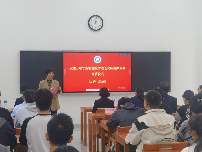 10月29日,安徽三联学院智能技术适老化应用微专业开班仪式在康养1号楼102教室举行。安徽三联学院副校长蔡文芬、副校长兼现代康养产业学院院长宋梦岚,教务处、现代康养产业学院相关负责人,学院教师代表和微专业全体学生参加仪式,合肥中科博谐科技有限公司总经理徐玉兵、安徽三联机器人科技有限公司市场部总监吴先春应邀参加。仪式由现代康养产业学院副院长李蓉晖主持。